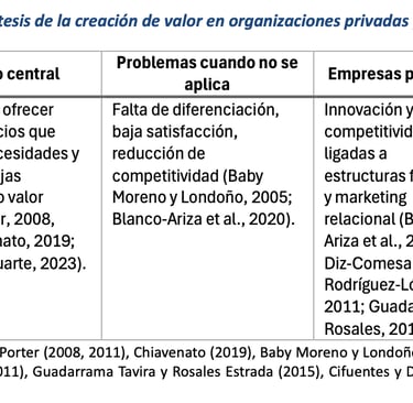 En cuanto a la creación de valor, Porter (2011) destaca que este constituye el núcleo de la estrategia competitiva. En el sector privado, la creación de valor implica innovación y diferenciación sostenida para enfrentar entornos de alta rivalidad (Blanco-Ariza et al., 2020). En el sector público, el valor se entiende en términos de legitimidad, confianza y capacidad de generar resultados sociales, lo que se relaciona con la noción de valor público y la integración de los múltiples actores sociales en la gestión (Cifuentes y Duarte, 2023).