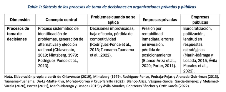 En el ámbito público, Ávila Morales, Contreras Sánchez y Ortiz García (2022) resaltan que la toma de decisiones estratégicas se convierte en un instrumento clave para la gestión orientada al desarrollo social. Sin embargo, Marín-Idárraga y Losada (2015) encontraron que, en instituciones prestadoras de salud en Colombia, la excesiva formalización limita la capacidad de respuesta, mientras que la descentralización y la cooperación interinstitucional fortalecen la eficacia del proceso de toma de decisiones. Estos resultados ponen evidencias que, en las organizaciones públicas, los problemas no derivan solo de factores técnicos, sino también de condicionantes estructurales y políticos.