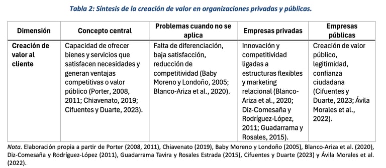 Por tanto, la creación de valor es un proceso complejo que integra dimensiones estratégicas, relacionales y sociales. En el sector privado se relaciona con la competitividad, la innovación y la retención de clientes, mientras que en el sector público se relaciona con la legitimidad y al bienestar social, como se resume en la Tabla 2. La evidencia teórica y empírica confirma que las organizaciones que gestionan el valor de manera integral logran consolidar ventajas sostenibles y fortalecer su capacidad de adaptación en contextos cambiantes.