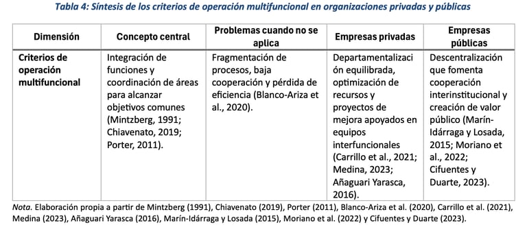 En conclusión, los criterios de operación multifuncional representan una condición indispensable para el desempeño organizacional contemporáneo, como se resume en la Tabla 4. Tanto en el sector privado como en el público, la multifuncionalidad permite superar la fragmentación de procesos, impulsar la innovación y optimizar el uso de recursos. La evidencia teórica y empírica confirma que las organizaciones que fomentan estructuras y equipos multifuncionales alcanzan mayores niveles de adaptación, fortalecen su legitimidad y aseguran la sostenibilidad de sus resultados.