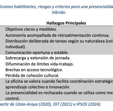 En este sentido, el liderazgo transformacional permite convertir el modelo híbrido en una práctica organizacional estable, donde la autonomía se articula con responsabilidad y la presencialidad adquiere valor como espacio de coordinación, aprendizaje e innovación.