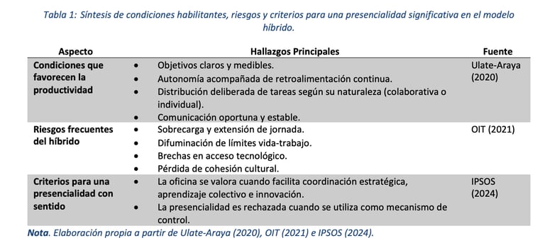 La adopción del trabajo híbrido permitió asegurar la continuidad operativa durante la pandemia; sin embargo, su sostenibilidad requiere rediseño organizacional y adecuaciones en la gestión. Informes de la OIT (2021, 2023) señalan que el trabajo híbrido no garantiza mejoras en productividad si no se acompaña de claridad en objetivos, soporte tecnológico y coordinación efectiva. En otro informe, la CEPAL-OIT (2022) advierte que la productividad en la región enfrenta limitaciones estructurales, por lo que los modelos híbridos deben integrarse en estrategias amplias de fortalecimiento organizacional y desarrollo de capacidades.